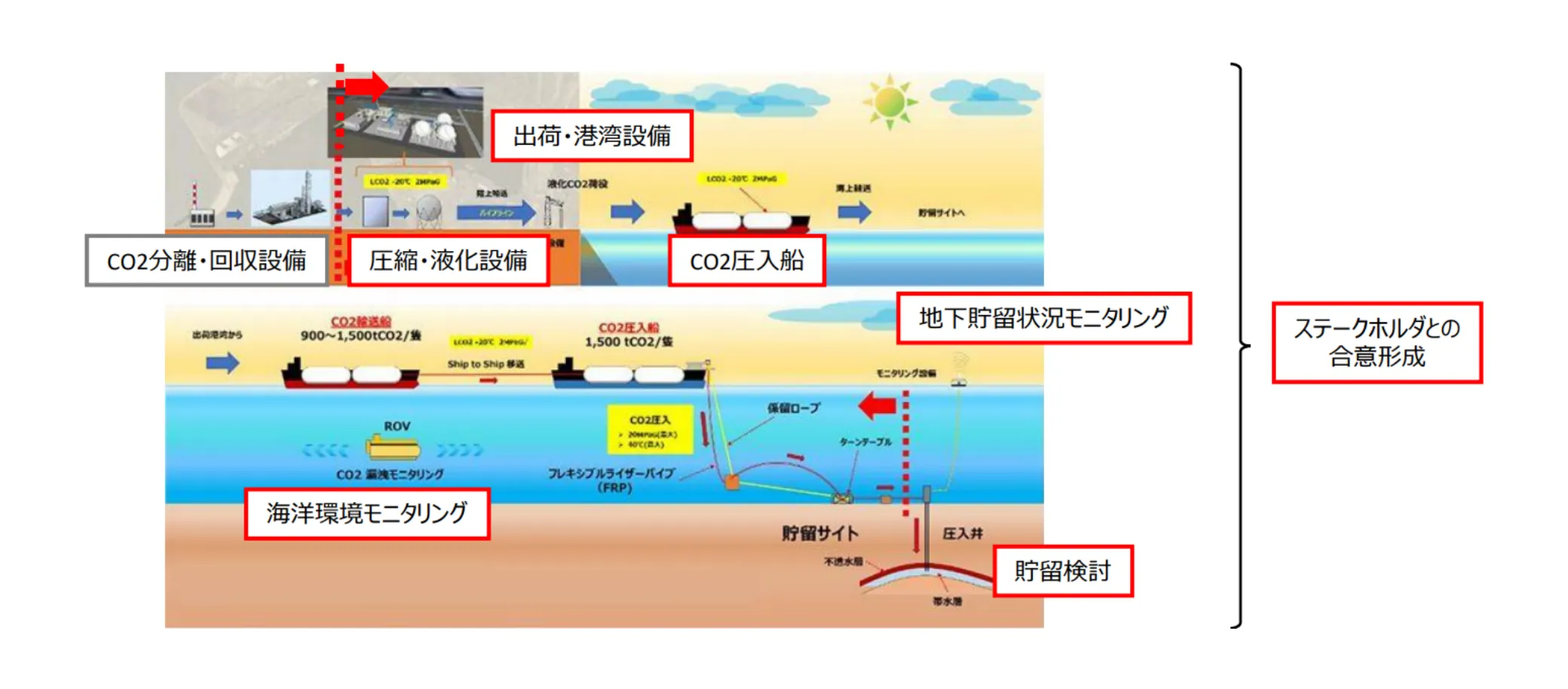 国内貯留候補地から詳細調査を行う場所の選定や掘削方法の検討などCO2貯留に関する検討及び、CO2の地下貯留状況と海洋環境の適切なモニタリング技術を確立した上で、一貫実証での適用を行うことの検討