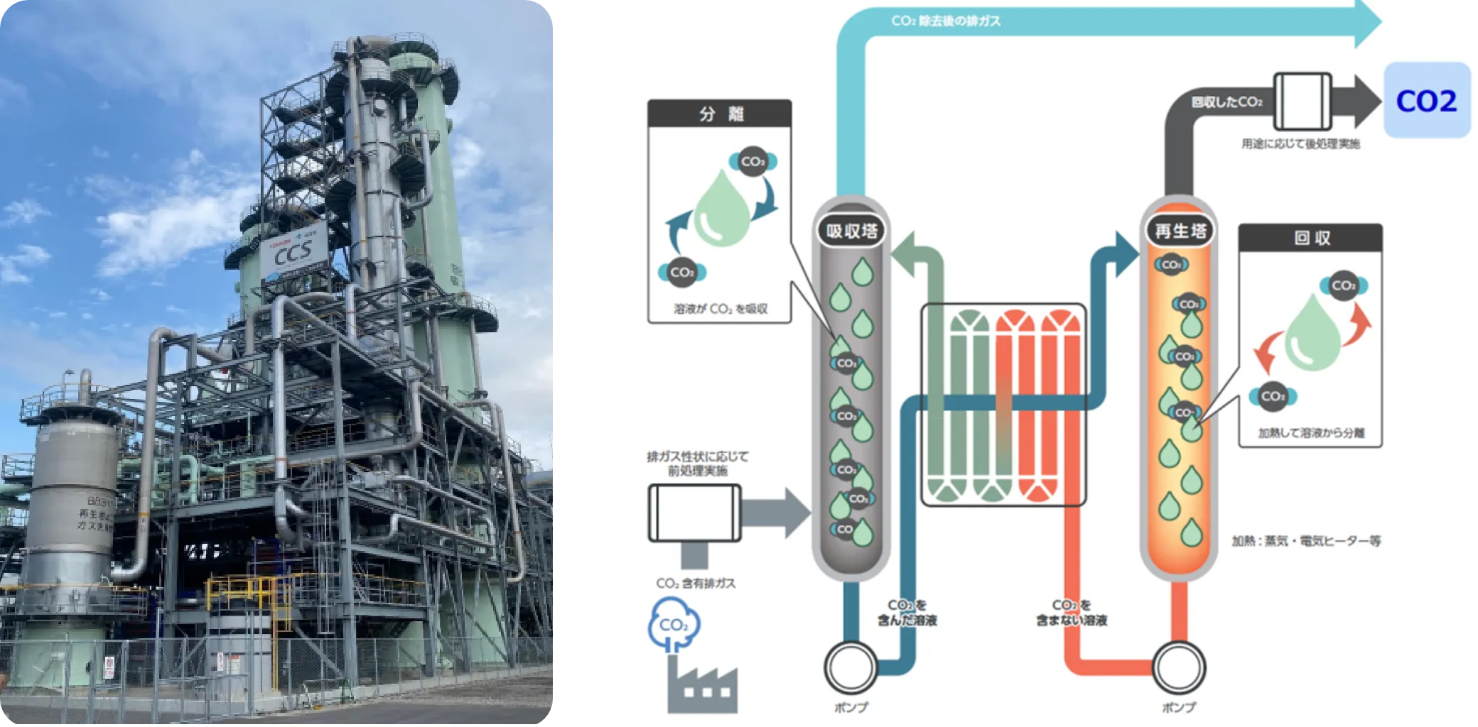 化学反応を利用して、CO2吸収することができる液体にCO2を分離する技術。化学吸収法の代表的な技術であるアミン吸収法は長い歴史を有し、石油、天然ガス、ガス化・石炭ガス化複合発電等の分野において広範に使用されています。